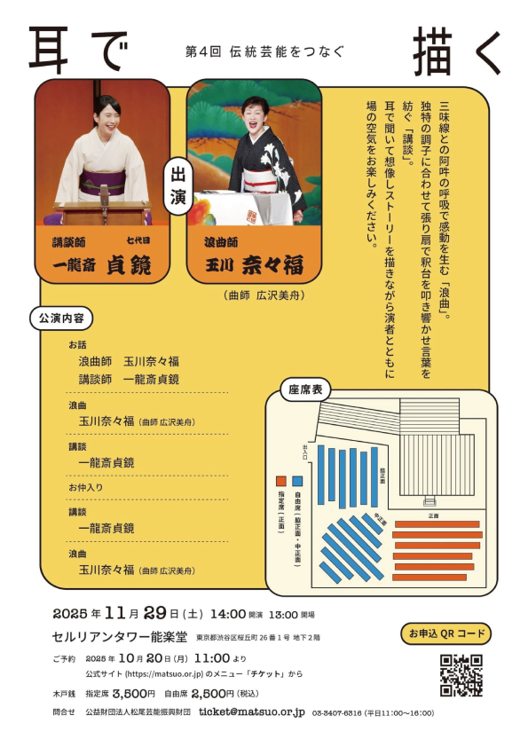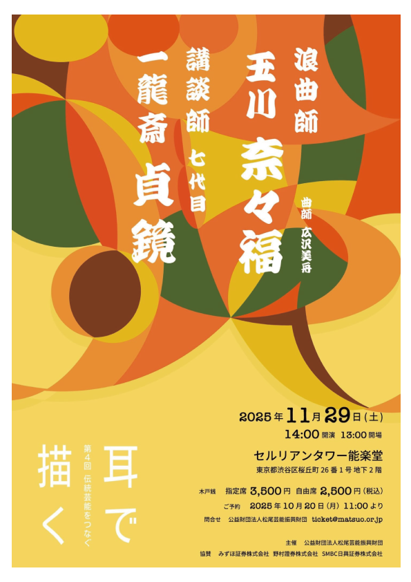 https://matsuo.or.jp/2025/08/20/%e8%87%aa%e4%b8%bb%e5%85%ac%e6%bc%942025%e3%80%8c%e7%ac%ac4%e5%9b%9e-%e4%bc%9d%e7%b5%b1%e8%8a%b8%e8%83%bd%e3%82%92%e3%81%a4%e3%81%aa%e3%81%90%e3%80%80%e8%80%b3%e3%81%a7%e6%8f%8f%e3%81%8f%e3%80%8d/