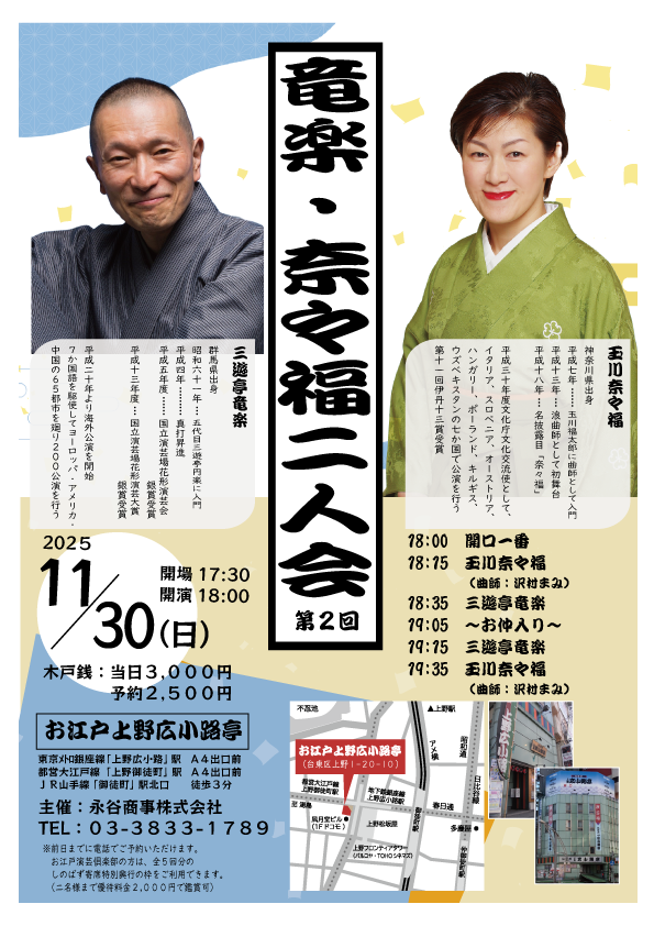 予約:上野広小路亭03-3833-1789 受付時間 11:00~19:00(不定休)
