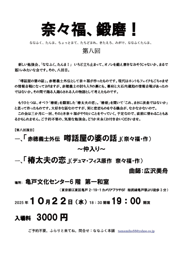 出演:玉川奈々福(曲師:広沢美舟)「シン・忠臣蔵」「俵星玄蕃」
