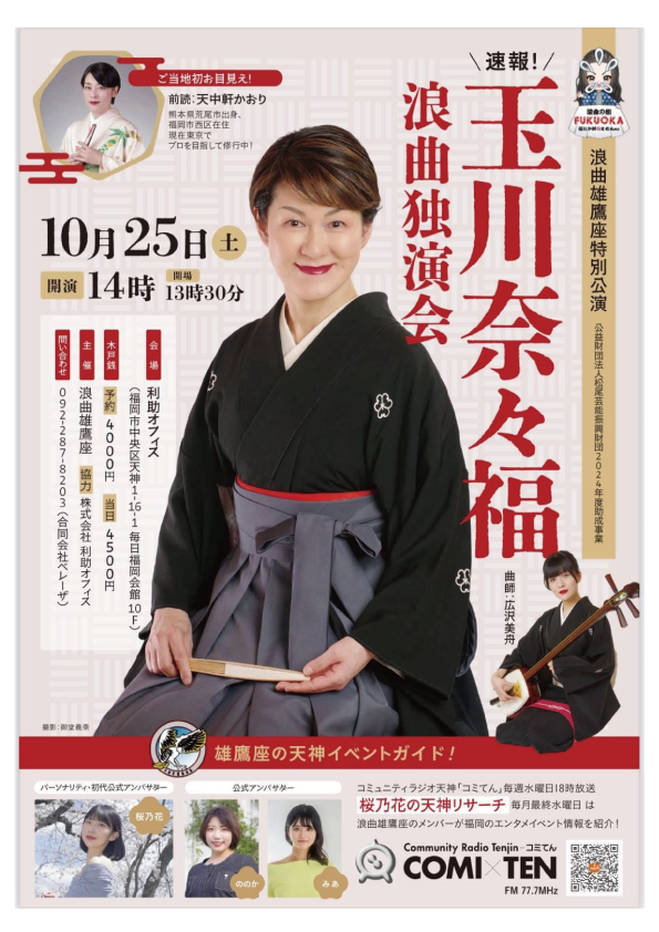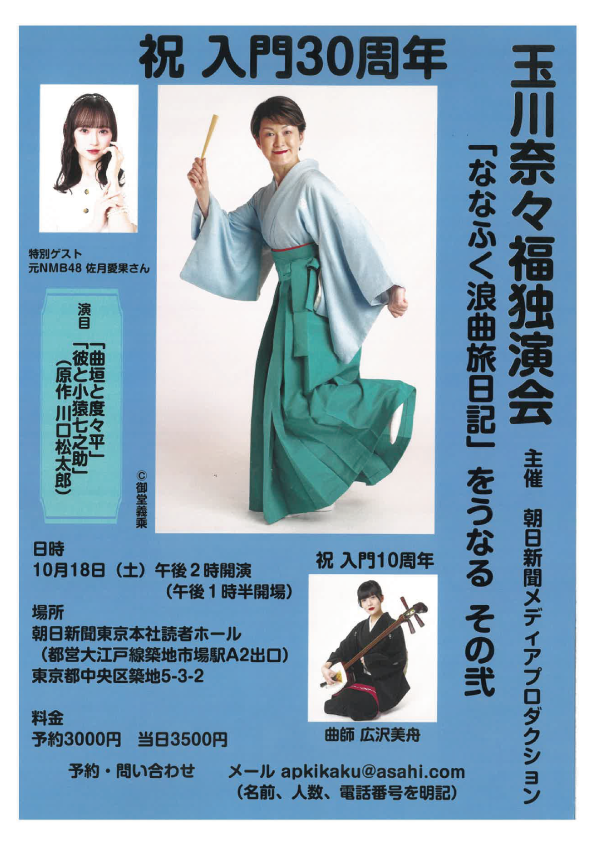 出演:玉川奈々福「浪花節更紗」(曲師・沢村まみ)天中軒すみれ(曲師:沢村理緒)