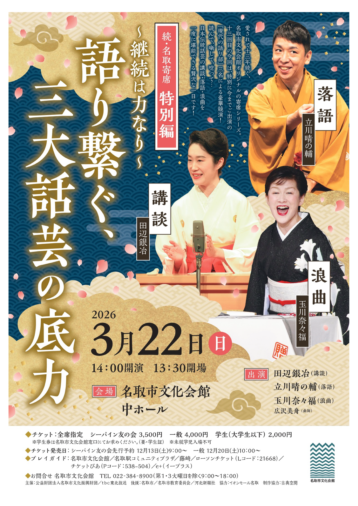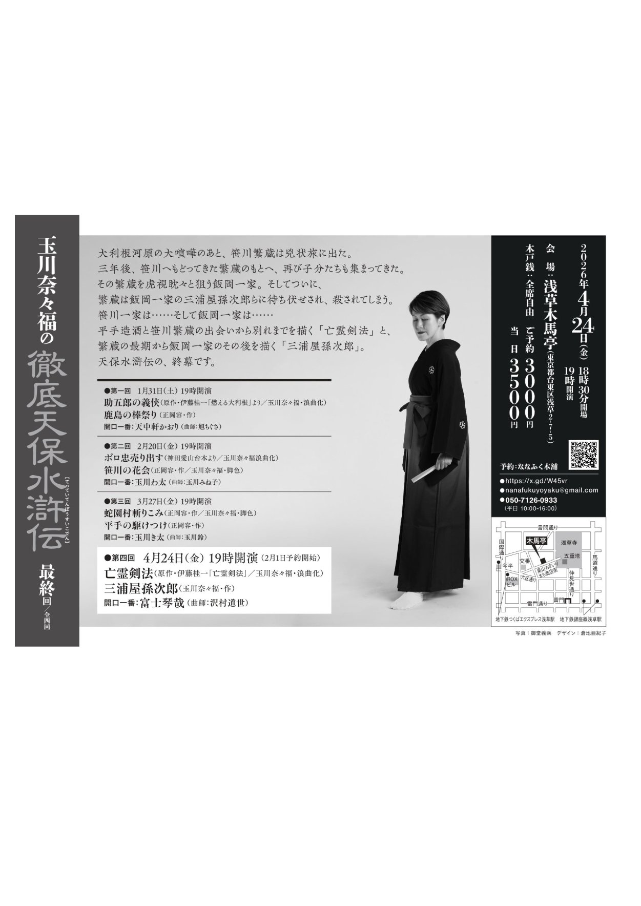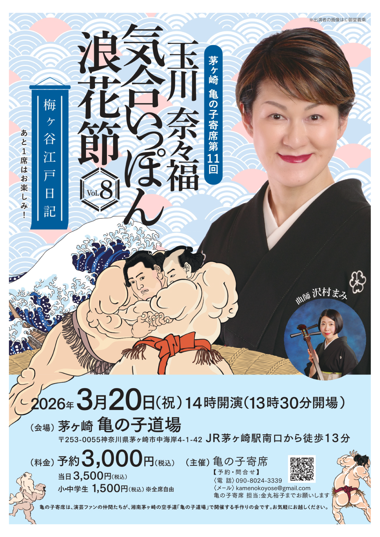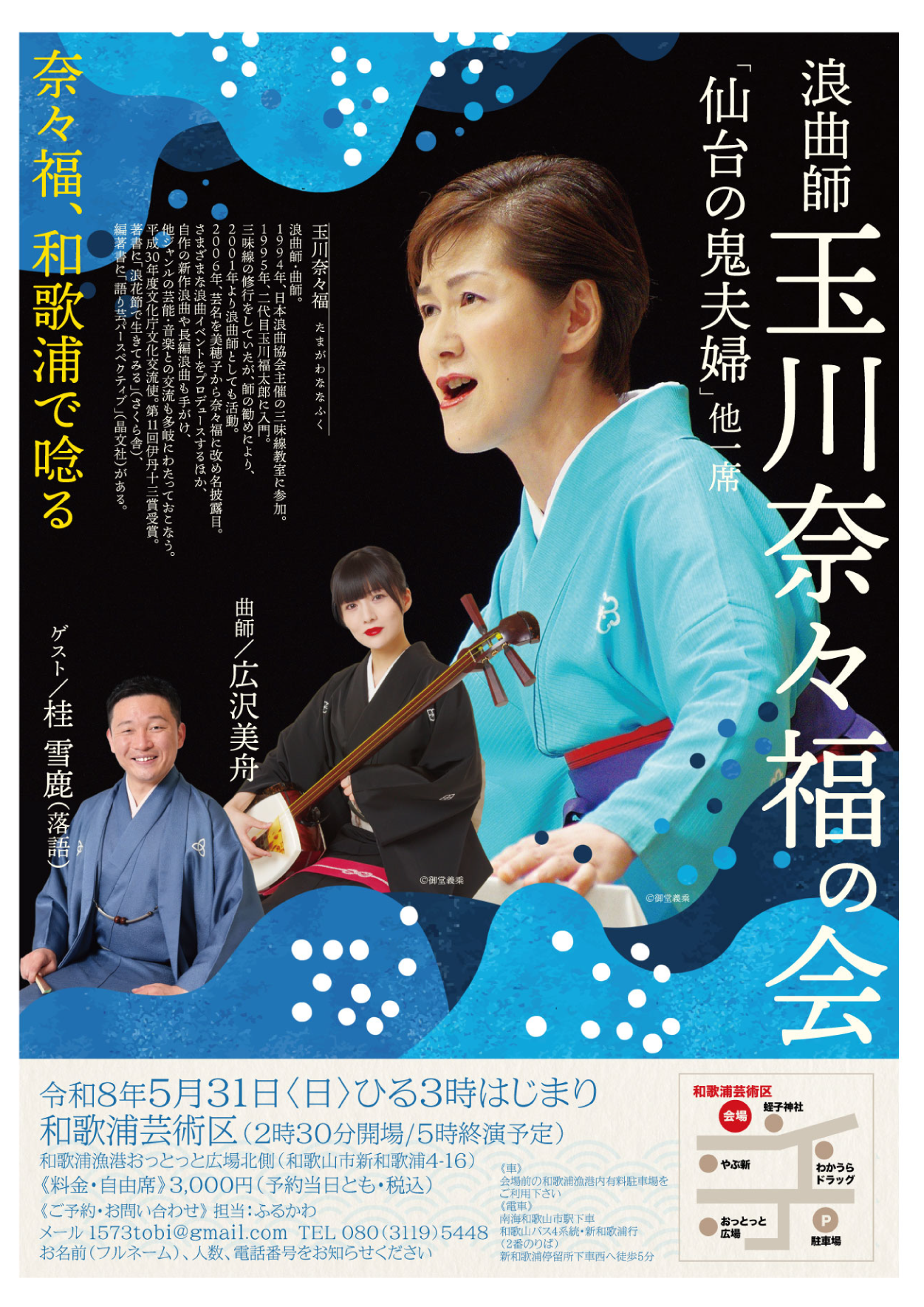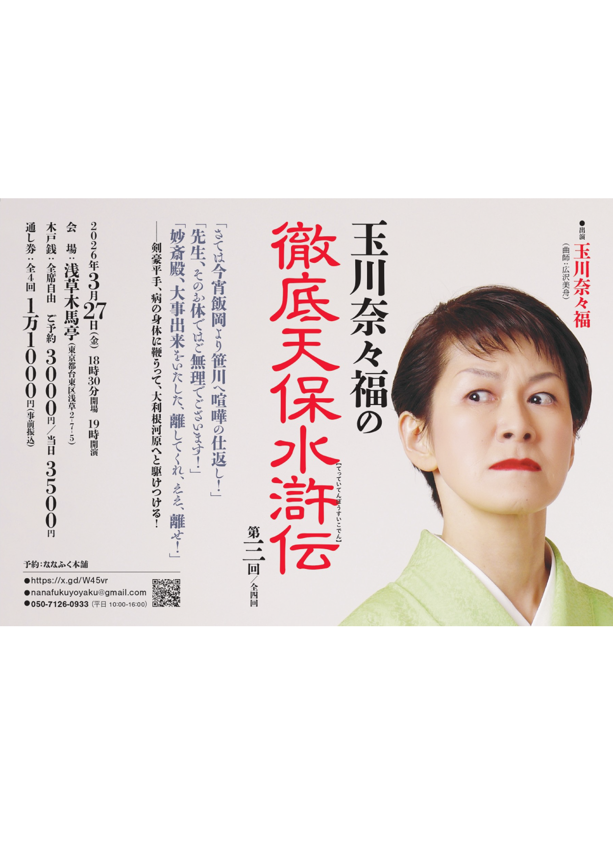出演:玉川わ太(みね子)三門綾(美舟)富士実子(秀勇)玉川太福(みね子)~仲入り~天中軒景友(美舟)神田桜子(講談)花渡家ちとせ(けい子)玉川奈々福(美舟)