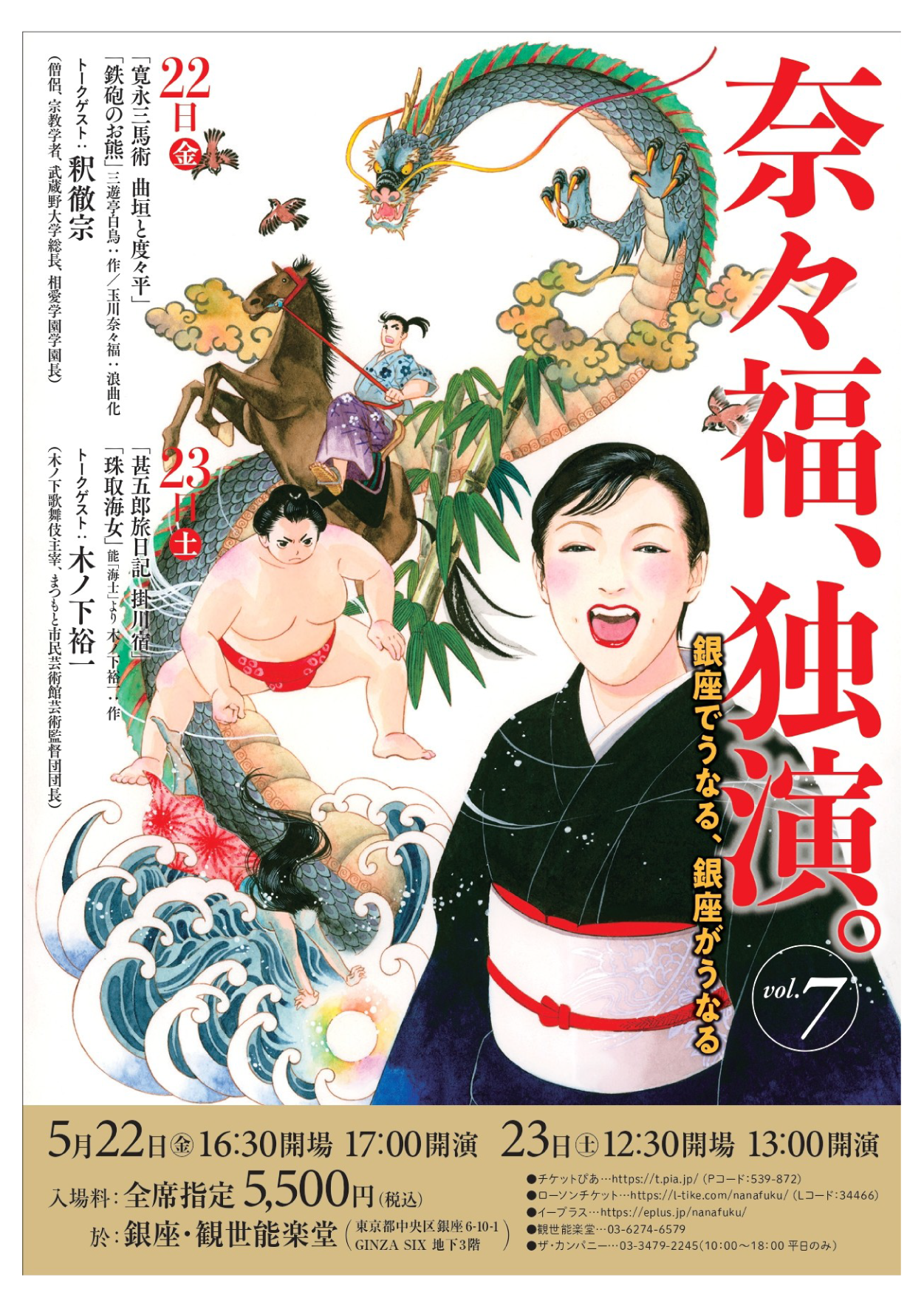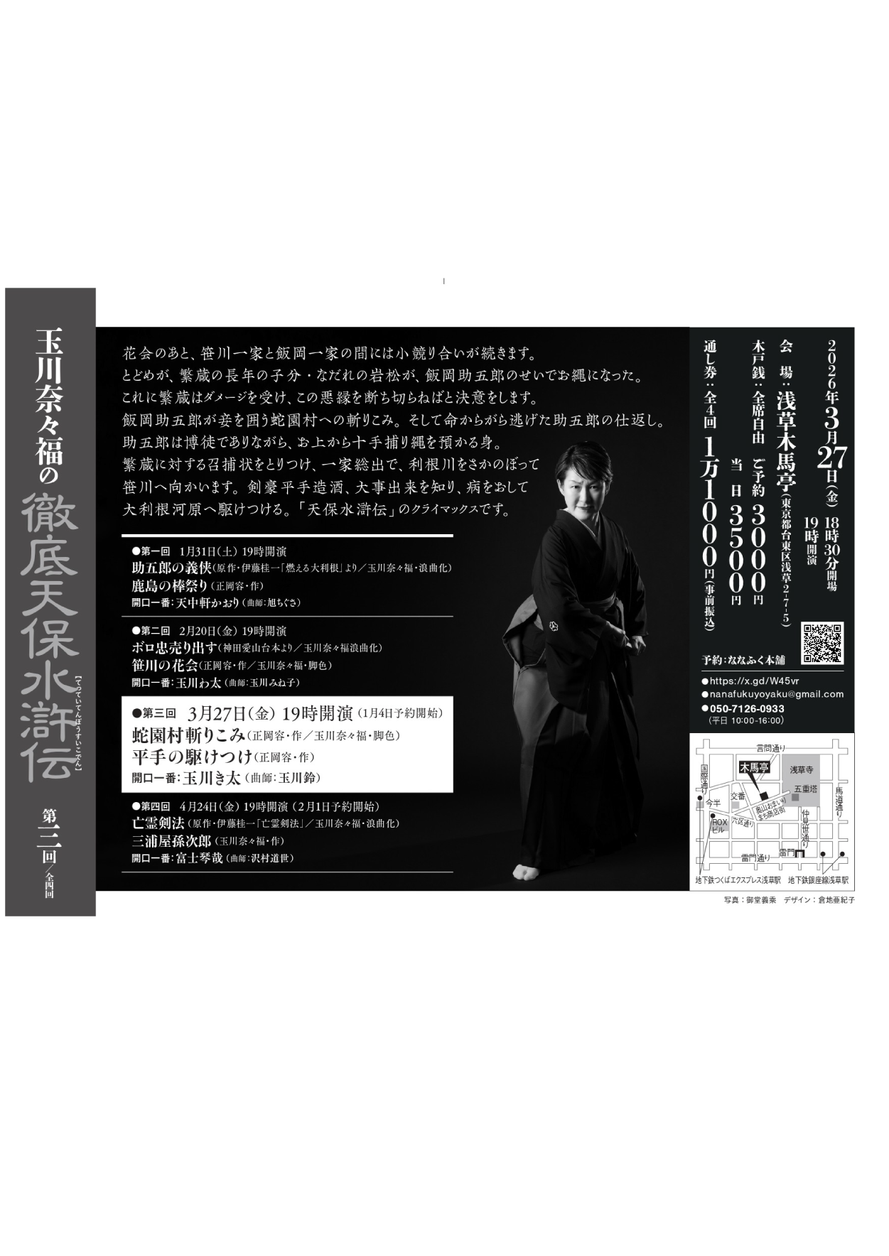 奈々福は13:30~能楽堂にて、新潟出身落語家立川らく萬さんと公演します。奈々福は、坂口安吾原作「桜の森の満開の下」を演じます(曲師:広沢美舟)。