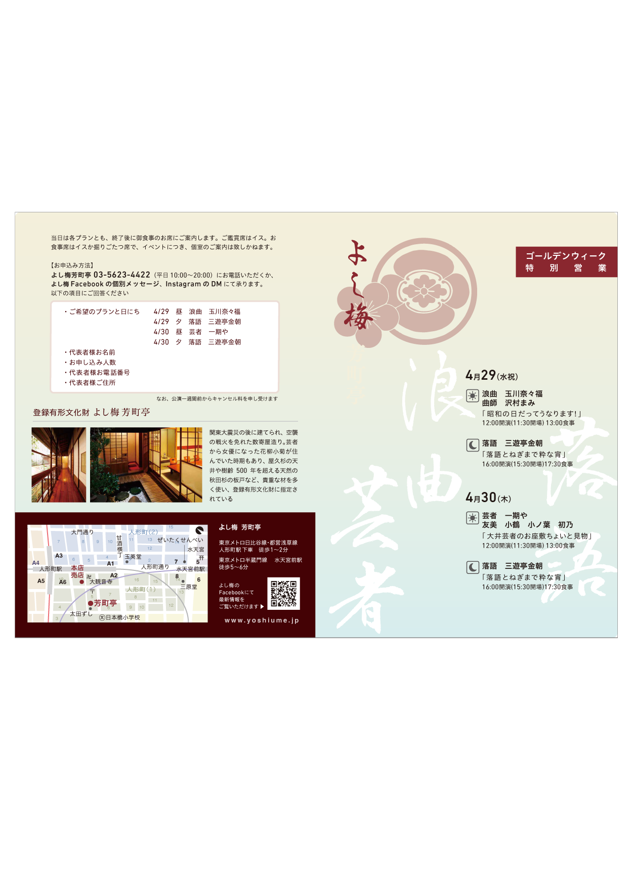 よし梅芳町亭03-5623-4422(平日10:00~20:00)にお電話いただくか、
